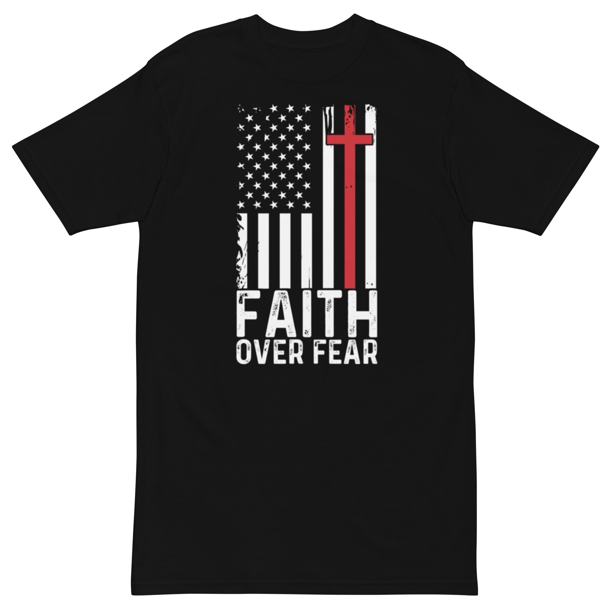 Stand strong in faith, no matter the battle. The “Faith Over Fear” Premium Heavyweight T-Shirt blends patriotism and devotion, reminding us that faith conquers all fear. Featuring a bold distressed American flag with a striking red cross in the stripes, this design symbolizes strength, courage, and unwavering belief.