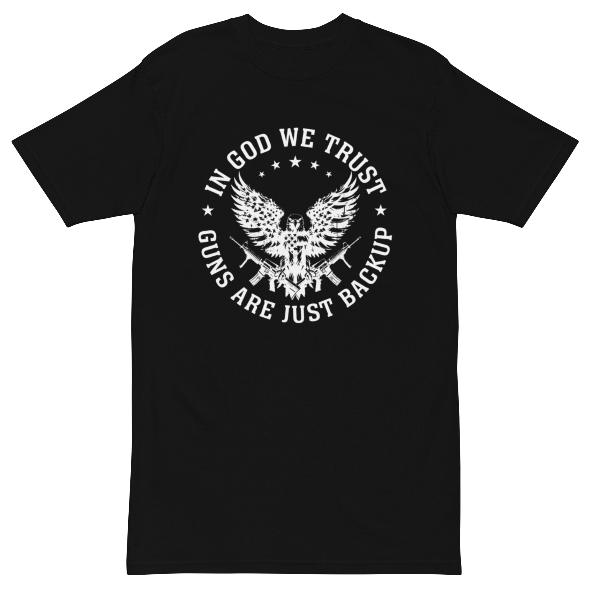 Faith leads the way, but readiness is never far behind. The “In God We Trust – Guns Are Just Backup” Premium Heavyweight T-Shirt is a powerful testament to the balance of trust in God and the responsibility of self-defense. Featuring a striking eagle clutching rifles, this design reflects unwavering conviction in both faith and the Second Amendment.